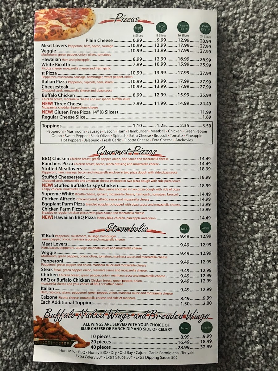 And, for a unique twist, Pizza Pi also offers an extensive selection of Buff Naked & Breaded Wings in various portion sizes, as well as Stuffed Stromboli like Chicken and Veggie.